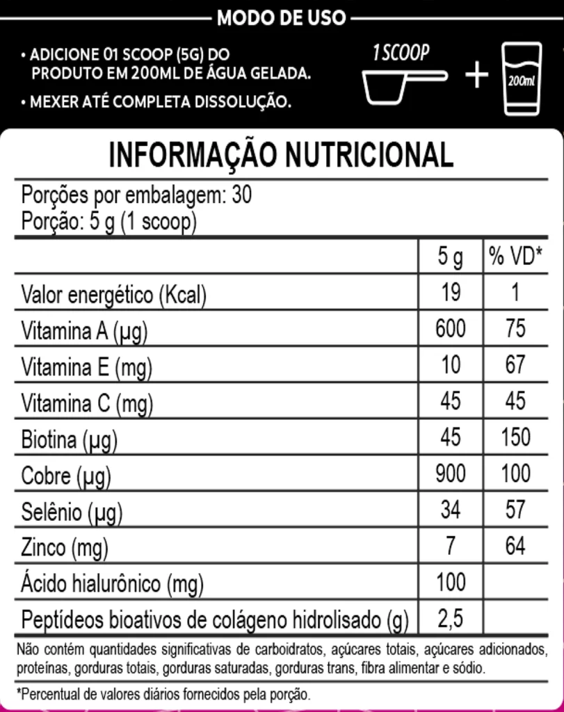 O colágeno com ácido hialurônico Deusa é um suplemento alimentar em pó produzido com ingredientes 100% naturais e não causa efeitos colaterais, porém, por possuir o ácido hialurônico em sua composição, recomendamos que gestantes, lactantes e crianças consultem um médico para avaliação da possibilidade de consumo antes da compra.